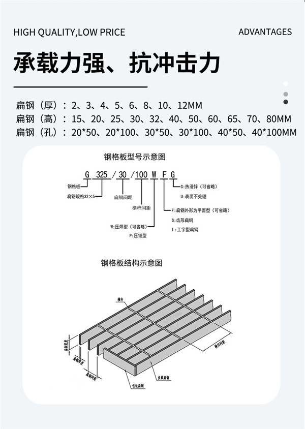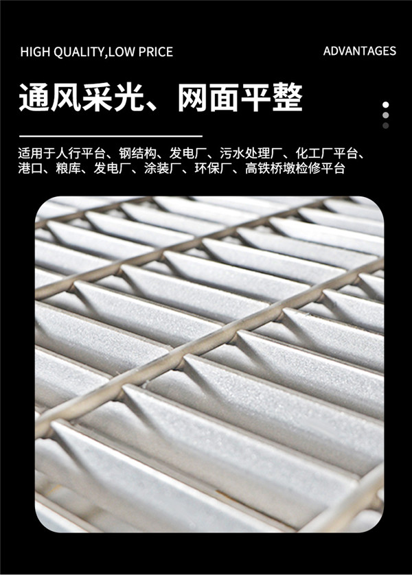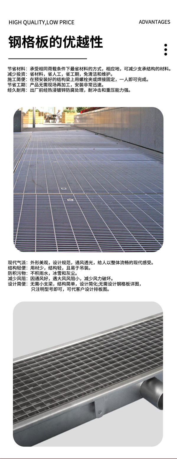 优点:重量轻、强度高、承载能力大、省材经济、通风透光、现代气派、外形美观、防滑安全、易于清扫、安装简便、经久耐用。